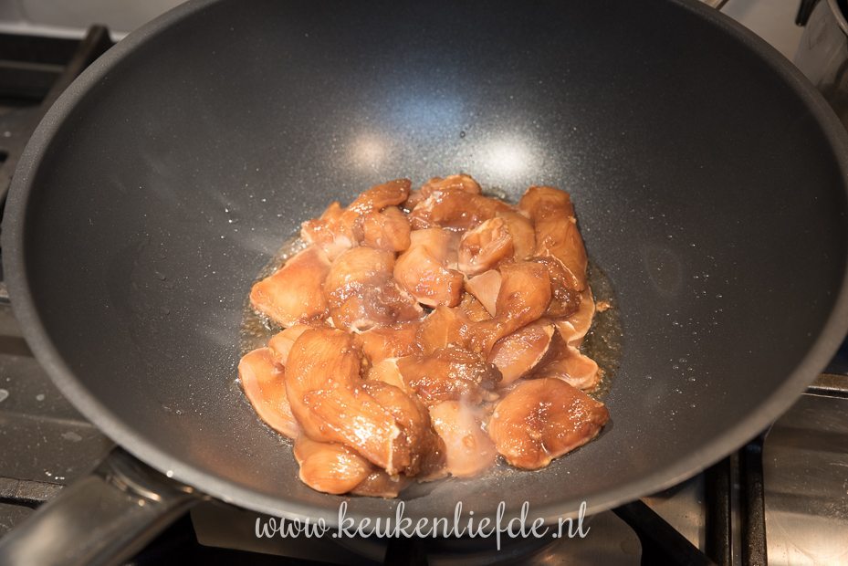 Verhit een hapjes- of wokpan met een scheutje arachide- of zonnebloemolie en bak de kip op hoog vuur. Als de kip bijna gaar is schep je hem uit de pan op een bord. Zet zolang opzij.