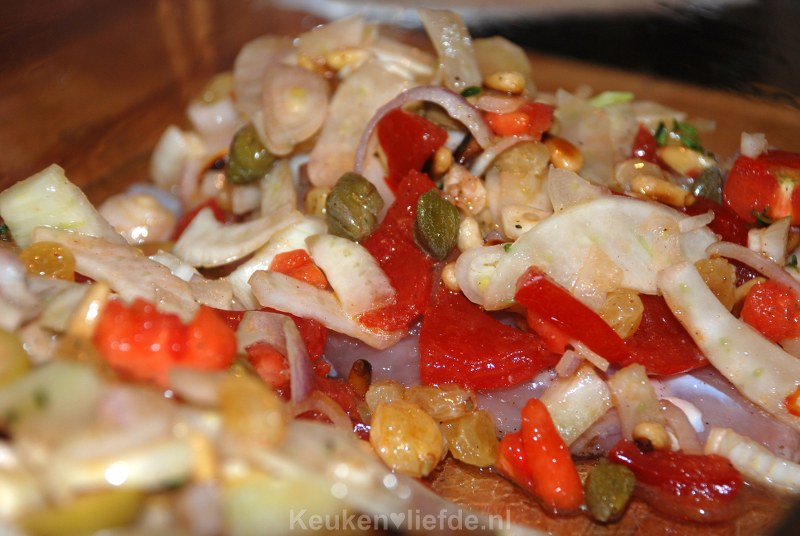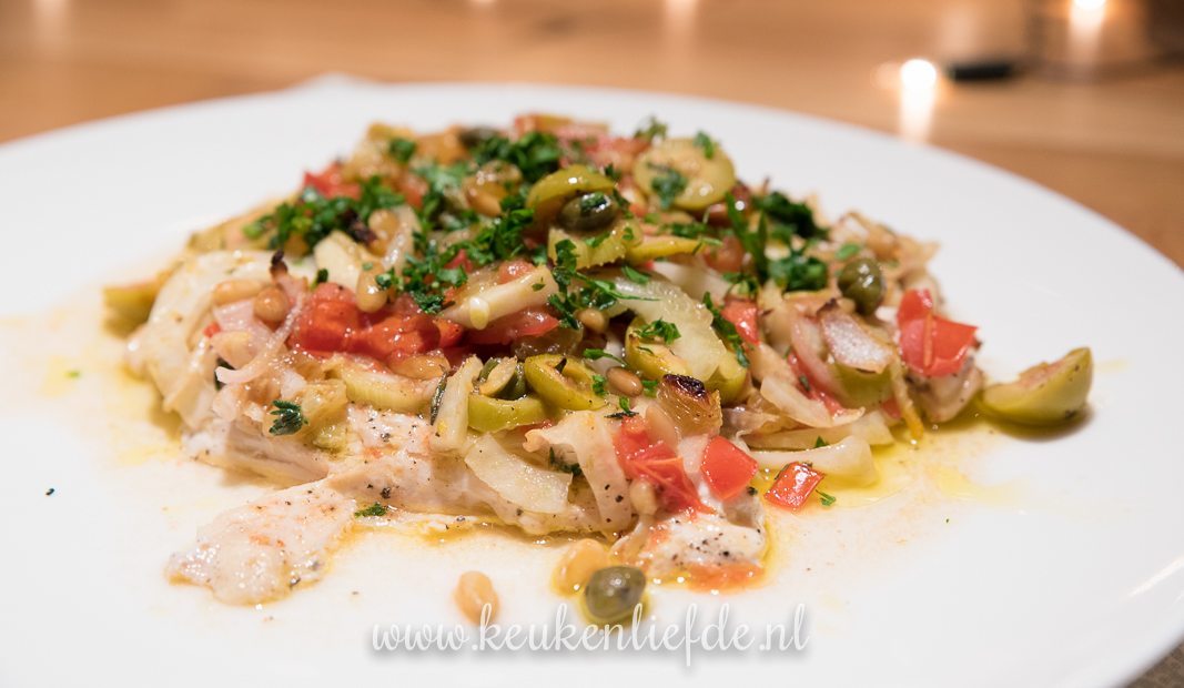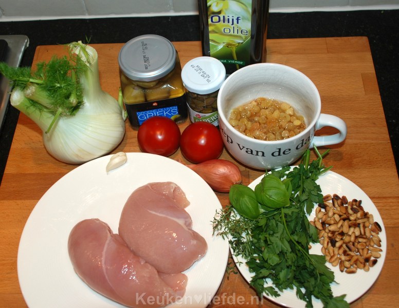 Deze kip uit de oven met venkel is echt the bomb! Het gerecht der gerechten, crème de la crème, het neusje van de zalm. Serieus. Dit was één van de allereerste recepten die ik poste op keukenliefde en behoort nog steeds tot mijn meest favoriete recepten. De frisse topping met venkel, rozijnen, kappertjes en olijven geeft een geweldige smaaksensatie aan de kip. Zoet, zuur, zout en bitter, alles is in perfecte balans met elkaar. Dit gerecht is mijn redding als ik zin heb in iets lichts, of als ik iemand wil verwennen met het ultieme gerecht.
