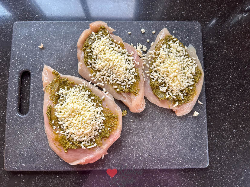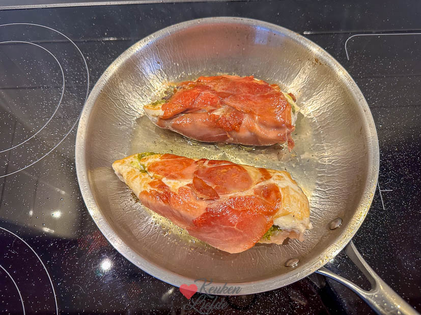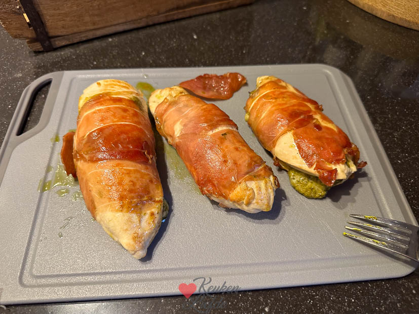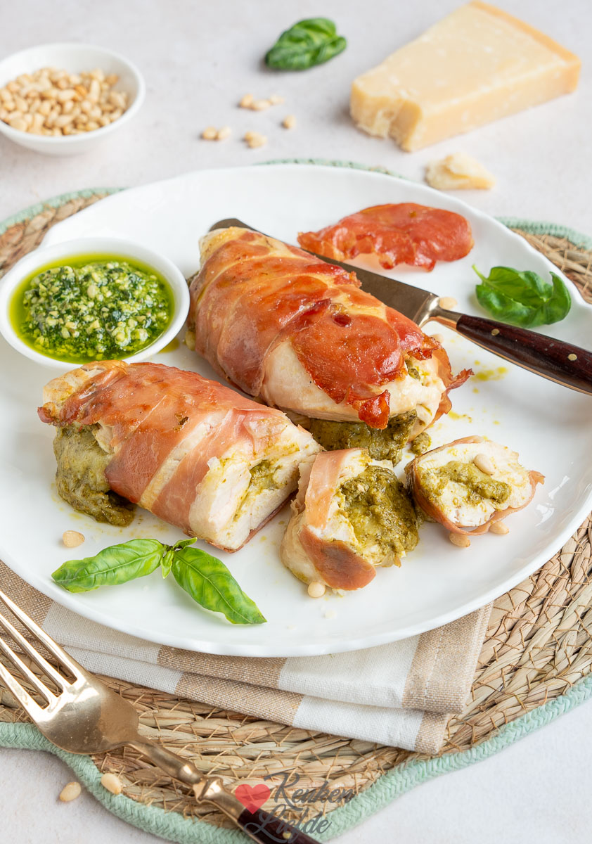 Gevulde kipfilet met pesto en mozzarella, omwikkeld met parmaham. Even bakken in de koekenpan om kleur te geven, daarna gaar je hem verder in de oven. De parmaham wordt lekker krokant en de kip blijft mals en sappig. Met een smeuïge kern van pesto en gesmolten kaas.