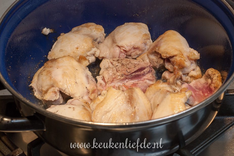 Verhit de braadpan met wat olie en laat heet worden. Bestrooi de kippendijen met zout en peper en bak ze in de olie rondom goudbruin. Haal de kippendijen uit de pan en leg ze op een bord — ze hoeven nog niet gaar te zijn, want ze garen straks verder in de saus.