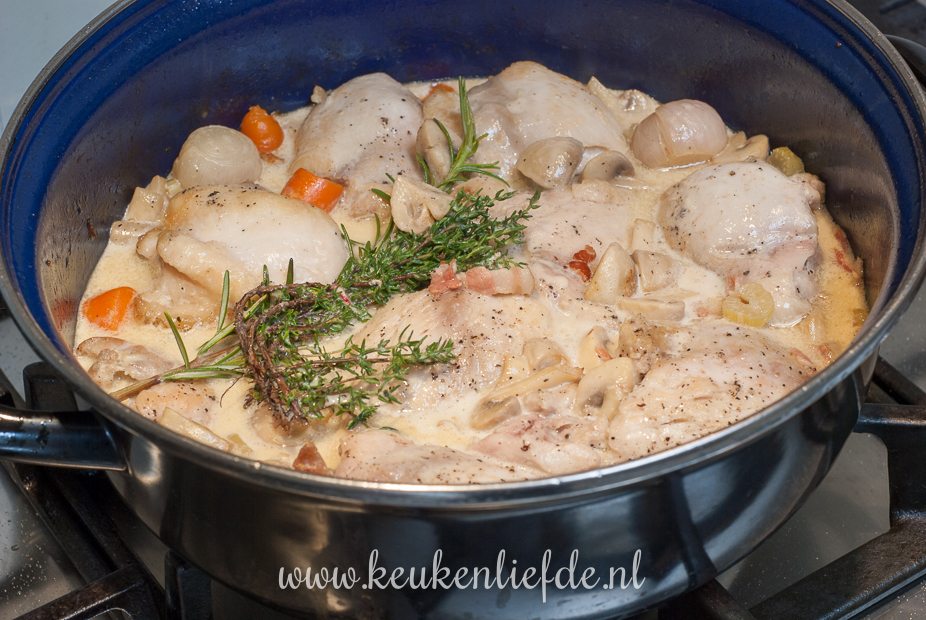 De saus zal vrij dun blijven, omdat deze niet gebonden is. Het is heerlijk om vers brood bij dit gerecht te serveren en hier het verrukkelijke stoofvocht mee op te deppen. Wil je liever een wat dikkere saus, voeg dan tijdens het bakken van de groenten 1 à 2 eetlepels bloem toe en bak circa 2 minuten mee om te laten garen. Voeg vervolgens de wijn en room toe.
