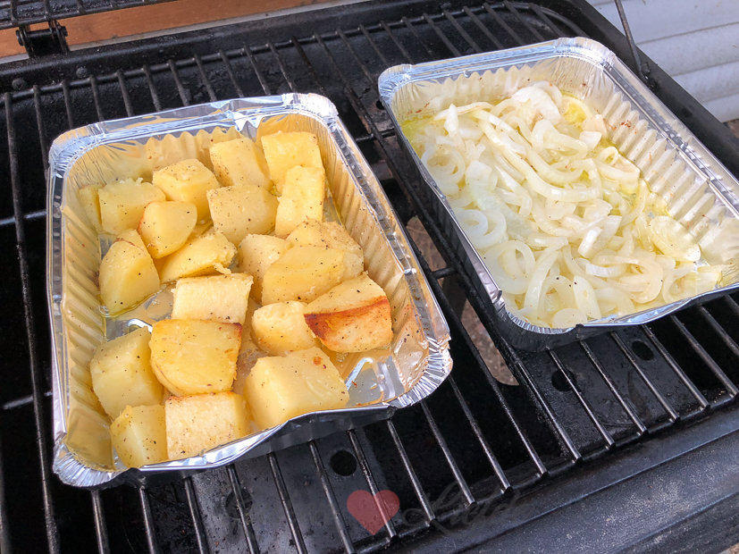 - Snijd 3 grote uien in ringen en doe in een aluminium barbecuebakje met een bodempje olijfolie en wat zout uit de molen. Bak de uien en aardappels op laag tot middelhoog vuur op de barbecue tot ze zacht en bruin zijn. Roer regelmatig even om. Houd ze warm.