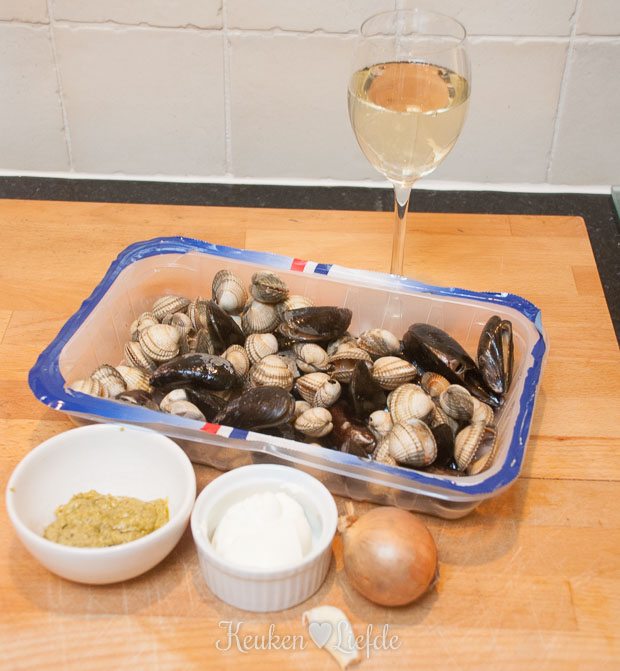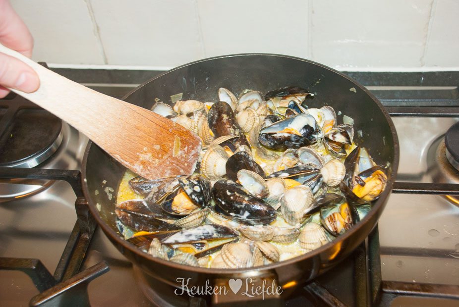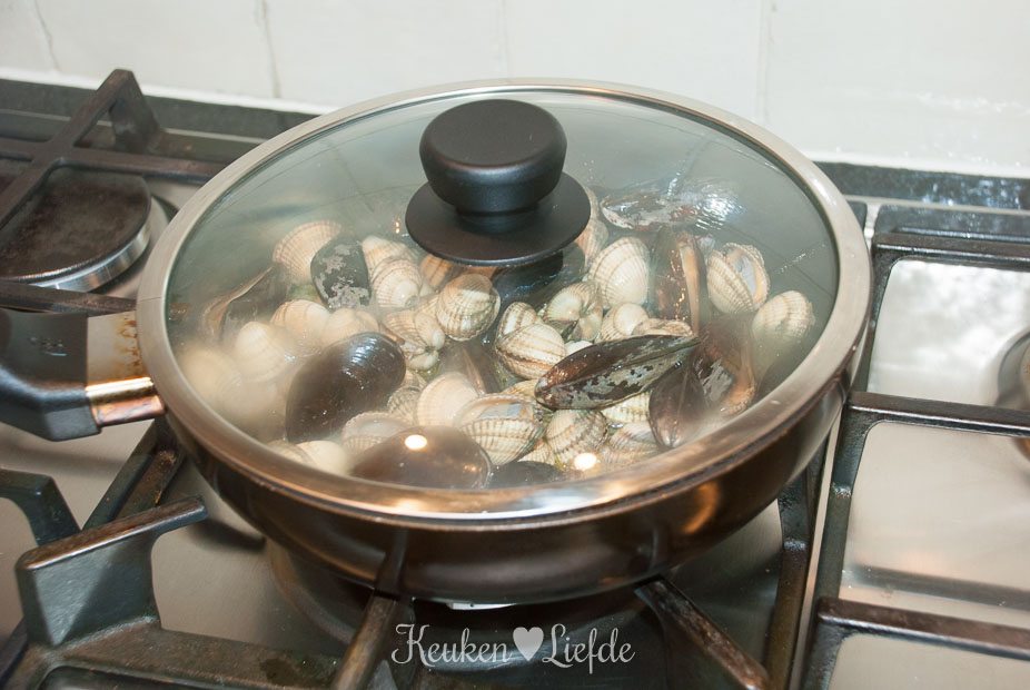 Was de kokkels en mosselen grondig met water en gooi kapotte schelpen weg. Gooi ook de schelpen weg die na het wassen nog openstaan en die na een tik op het aanrecht nog steeds open blijven staan.