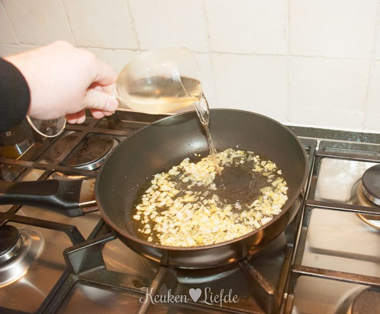 Verhit een grote koekenpan met wat olie en fruit op laag vuur de ui en knoflook aan. Blus af met de witte wijn en voeg de kokkels en mosselen toe. Doe de deksel op de pan en kook totdat alle schelpen openstaan.