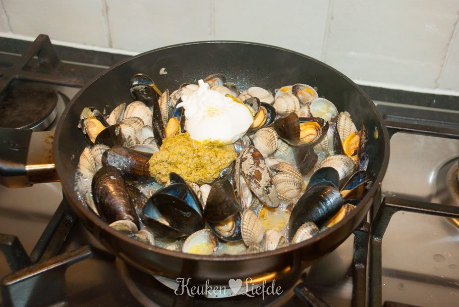 Heb jij nog nooit kokkels of mosselen gegeten, maar wil je ze dolgraag eens proberen? Deze kokkels en mosselen in pestoroomsaus zijn een aanrader! Na het proeven van dit gerecht werd ik helemaal wild van enthousiasme, want wow, wat is dit lekker! Wij aten ze tijdens de lunch met een goed stuk boerenbrood erbij. Een aanrader, want dat hemelse kookvocht met pesto en room wil je opdeppen. Geloof me.