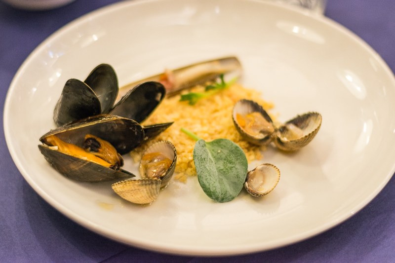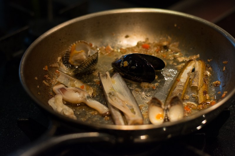 Op het zand liggen wat kort gebakken kokkels, scheermessen en mosseltjes die besprenkeld zijn met een eigen jus van wat fijngesnipperde sjalot, rode peper, knoflook, witte wijn en sushi-azijn. Zodra de schelpen opengaan, zijn ze klaar.