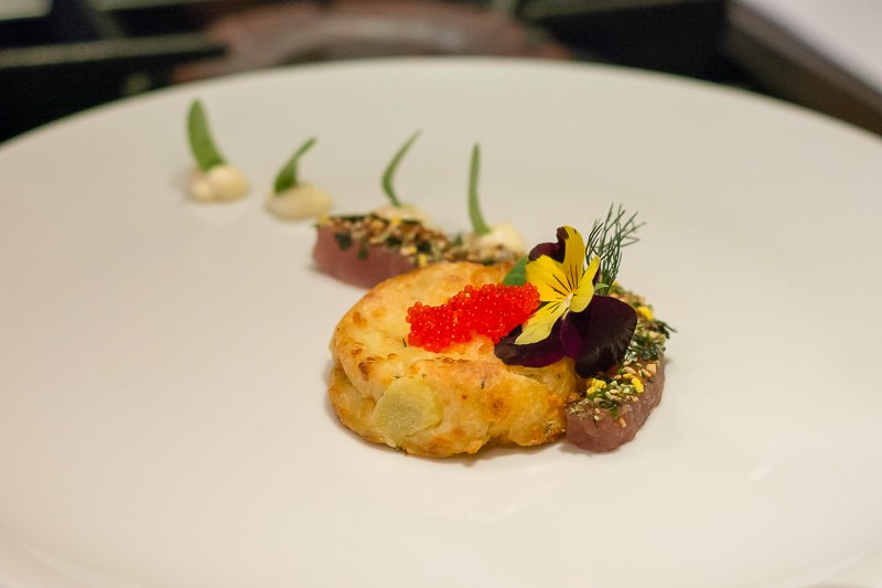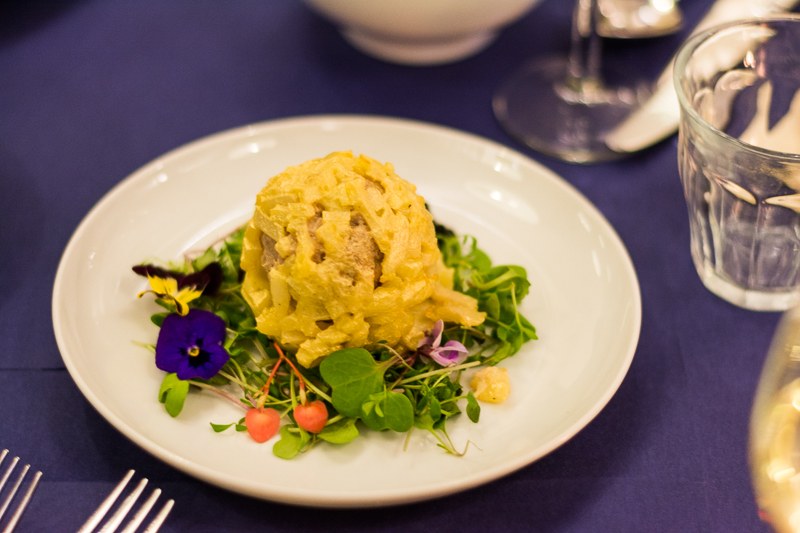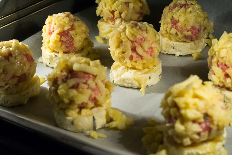 Kalfsgehaktballen ‘gepaneerd’ in kort gefruite Aviko Rösti Original en wat fijngesnipperde ui op een gehalveerde Aviko-gratin met tijm en rozemarijn en tot slot feestelijk omhuld in eetbare goudspray.