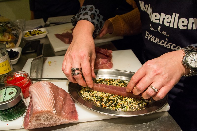 Voor dit gerecht wordt kraakverse tonijn (sashima-kwaliteit) gebruikt, in dunne repen gesneden en aan één kant in furikake gedrukt.