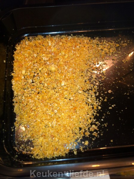 Dit ‘zand’ maakte Jeremy van Aviko Rösti Original, gedroogd in de oven op 150 graden. De rösti moet licht van kleur blijven maar wel krokant worden. Vervolgens wordt dit fijn gemalen in de keukenmachine samen met wat parelmoer kleurstof. Dit geeft een prachtige glinstering aan het zand waardoor het echt lijkt. Erg leuk én lekker!