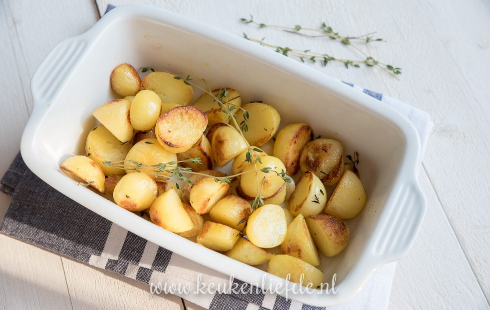 Bak circa 45 tot 50 minuten in de oven, of totdat de krieltjes goudbruin zijn. Schep ze halverwege de baktijd een keer om.