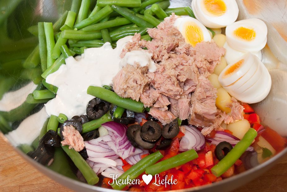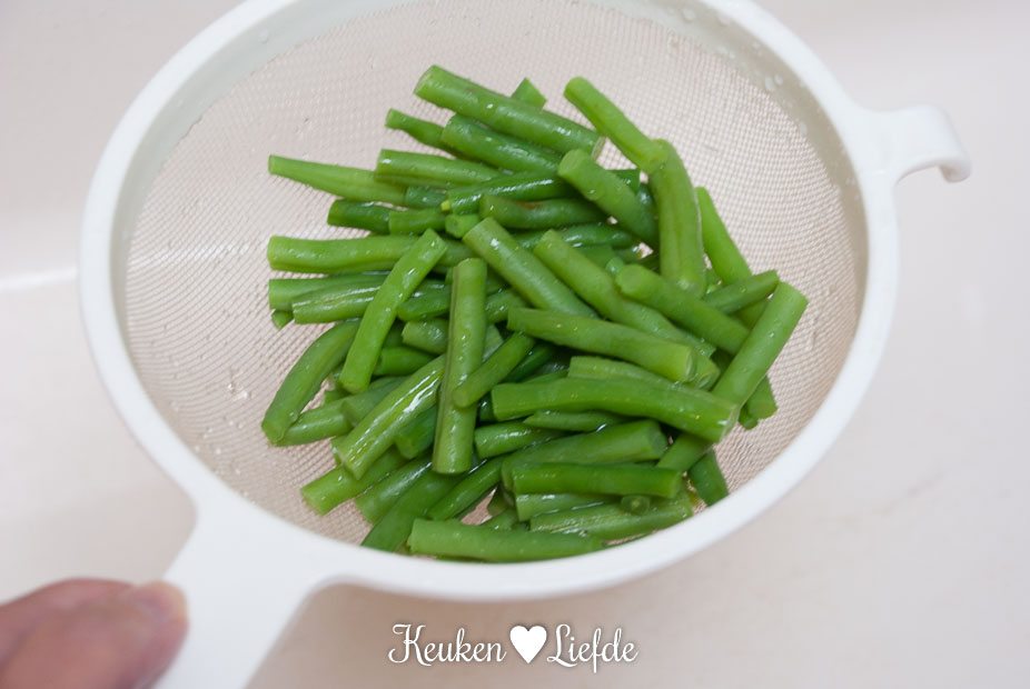 Kook de eieren in circa 8 minuten hard. Spoel af met koud water en pel direct. Kook de krieltjes beetgaar, giet ze af en laat goed uitlekken. Snijd de puntige uiteinden van de sperziebonen en halveer ze. Kook de sperziebonen beetgaar en spoel ze af met koud water om verdere garing te stoppen. Laat uitlekken. Snijd de eieren in plakjes.