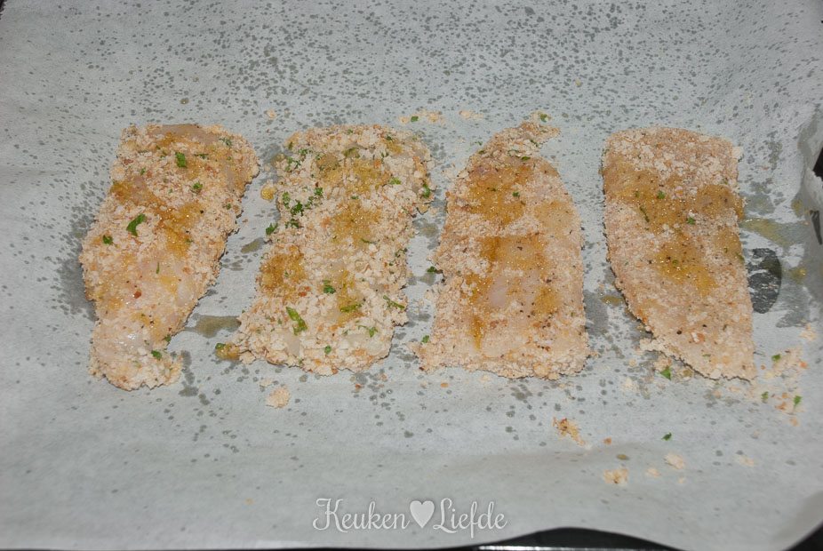 Bak de vis circa 10 minuten in de oven, of totdat het paneermeel licht goudbruin is en de vis vanbinnen glanzend is.