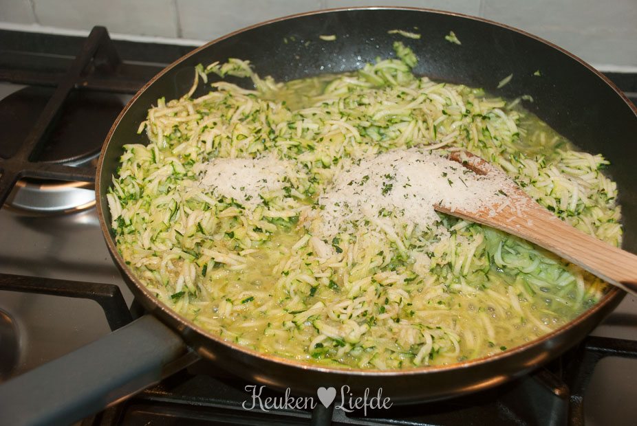 Verhit een koekenpan met wat olijfolie en voeg de courgettes, pesto en Parmezaan toe. Breng eventueel op smaak met zout en peper. Bak de courgettes op hoog vuur. De courgettes laten veel vocht los, waardoor ze gaar smoren in hun eigen vocht. Laat het vocht grotendeels op hoog vuur verdampen, totdat de courgettes gaar zijn.