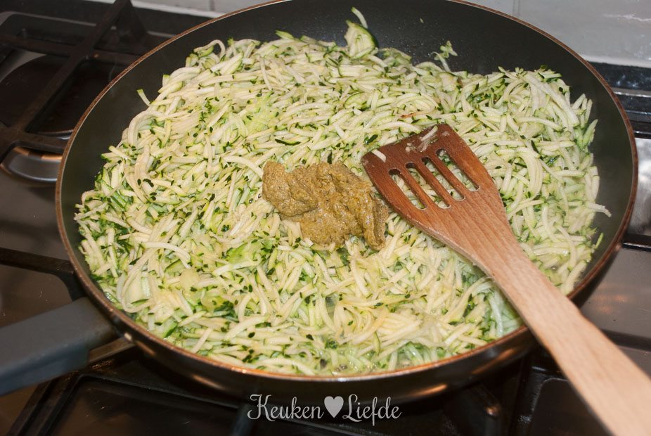 Verhit een koekenpan met wat olijfolie en voeg de courgettes, pesto en Parmezaan toe. Breng eventueel op smaak met zout en peper. Bak de courgettes op hoog vuur. De courgettes laten veel vocht los, waardoor ze gaar smoren in hun eigen vocht. Laat het vocht grotendeels op hoog vuur verdampen, totdat de courgettes gaar zijn.
