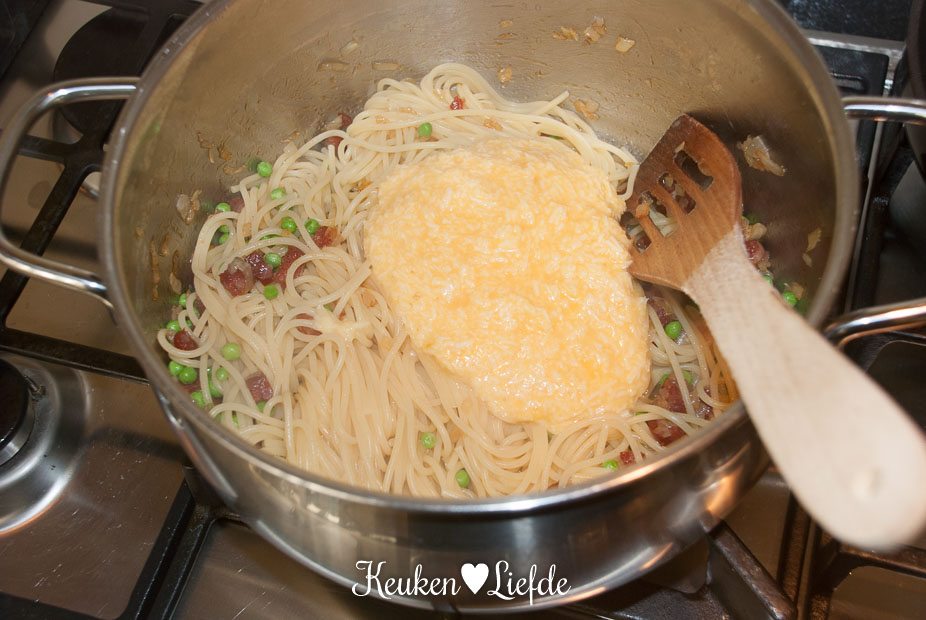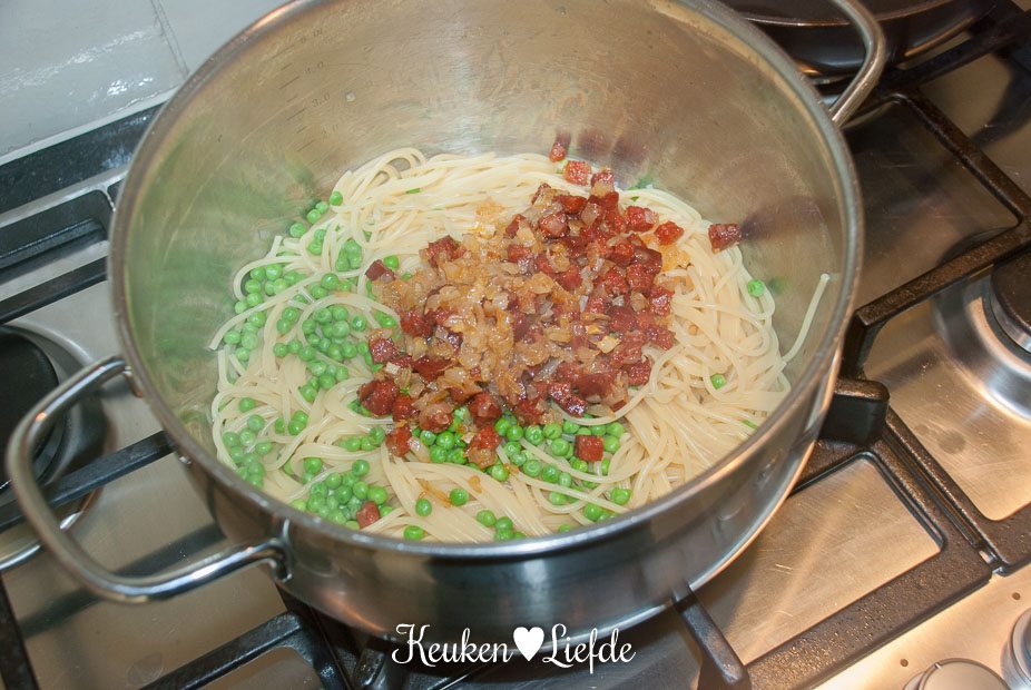 Je kunt eventueel ook slagroom toevoegen aan de doperwten en chorizo en iets laten inkoken. Klaar is je saus. 🙂