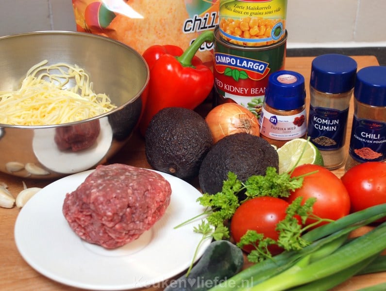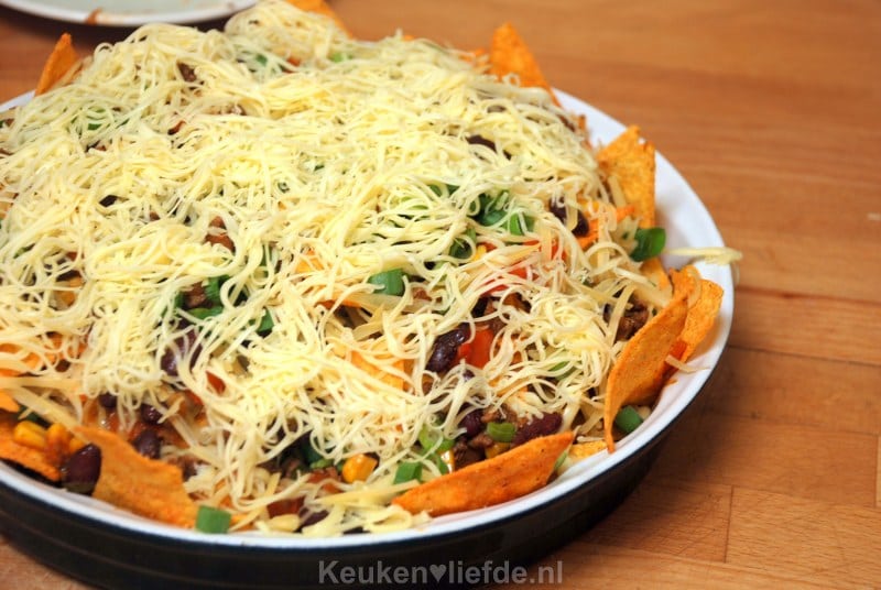 Verwarm de oven voor op 200 graden. Vet de ovenschaal in en bedek de bodem met een laagje tortillachips. Bedek met een laagje gehakt en geraspte kaas en herhaal deze lagen tot de ingrediënten op zijn. Eindig met gehakt en kaas.