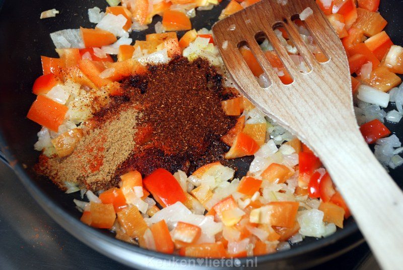 Verhit een grote koekenpan met wat olie en fruit de ui, knoflook en paprika op laag vuur tot ze zacht zijn. Voeg de specerijen toe en bak kort nog even verder.