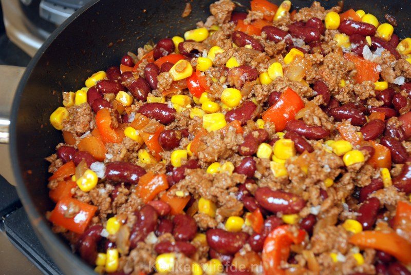 Voeg het gehakt toe en roer met een vork los. Breng goed op smaak met zout en peper. Voeg de kidneybonen en mais toe en laat op laag vuur zachtjes pruttelen totdat het gehakt gaar en zacht is en het vocht bijna verdampt is.
