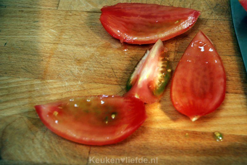 Halveer de tomaten en verwijder het sap en de zaadlijsten. Snijd de tomaten in blokjes.