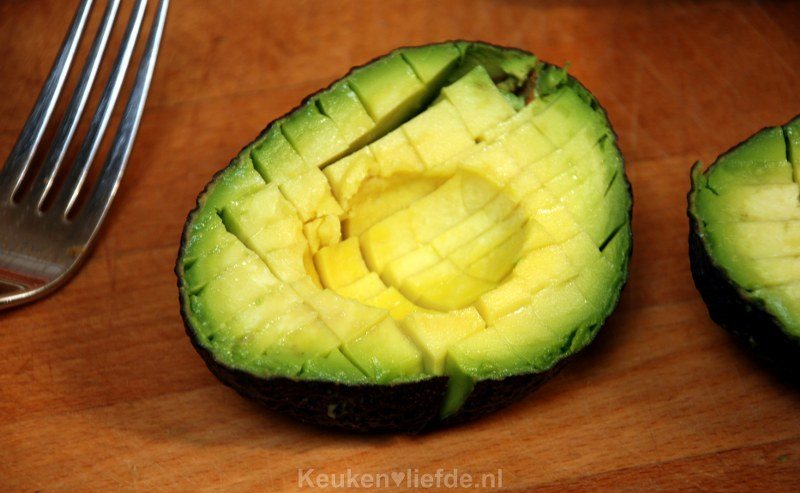 Halveer de avocado over de lengte en verwijder de pit. Snijd het vruchtvlees, in de schil, in blokjes en schep het vruchtvlees vervolgens met een lepel uit de schil.
