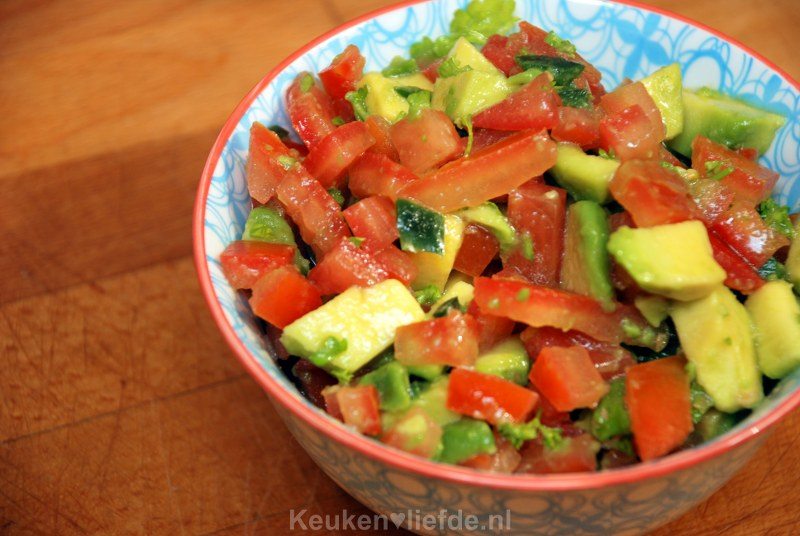 Meng de tomaat, avocado, jalapeño, peterselie en limoensap voorzichtig in een kom en breng op smaak met zout en peper.