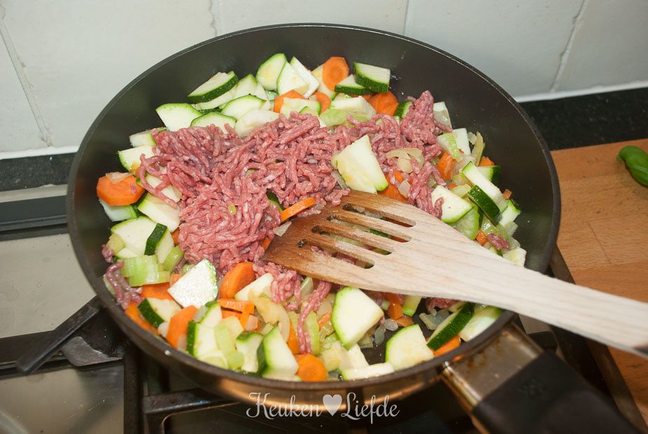 Verhit de koekenpan met wat olie en fruit de ui en knoflook, totdat ze zacht zijn. Zet het vuur wat hoger en voeg de groenten toe. Bak verder, totdat ook de groenten wat zachter zijn en voeg dan het gehakt toe. Bak het gehakt rul. Voeg de gezeefde tomaten, suiker, basilicum en wat zout en peper toe en laat op laag vuur circa 10 minuten zachtjes pruttelen.