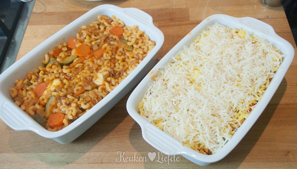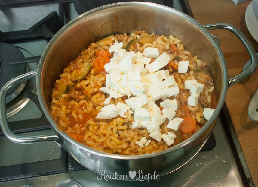 Kook ondertussen de macaroni iets harder dan beetgaar. Giet de macaroni af en doe terug in de pan. Voeg de tomaten-gehaktsaus toe aan de macaroni en voeg de mozzarella toe.