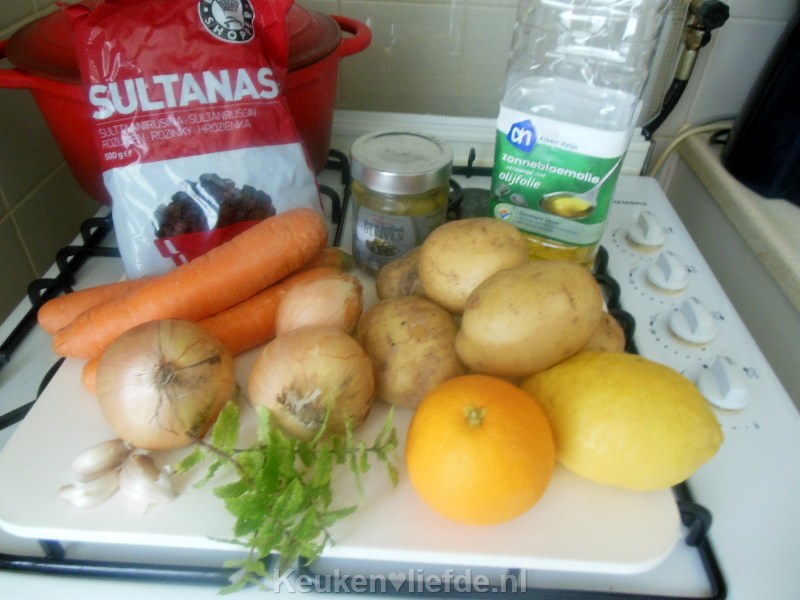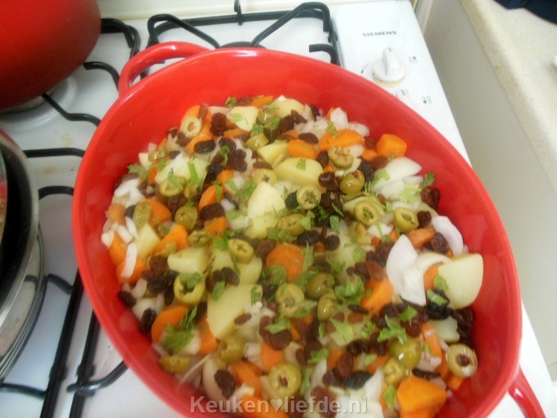 In een ovenschaal de wortel, ui, knoflook en aardappel mengen met de in plakjes geneden olijven en de sultanas. De kip en de stukken fruit ertussen leggen en bestrooien met munt.