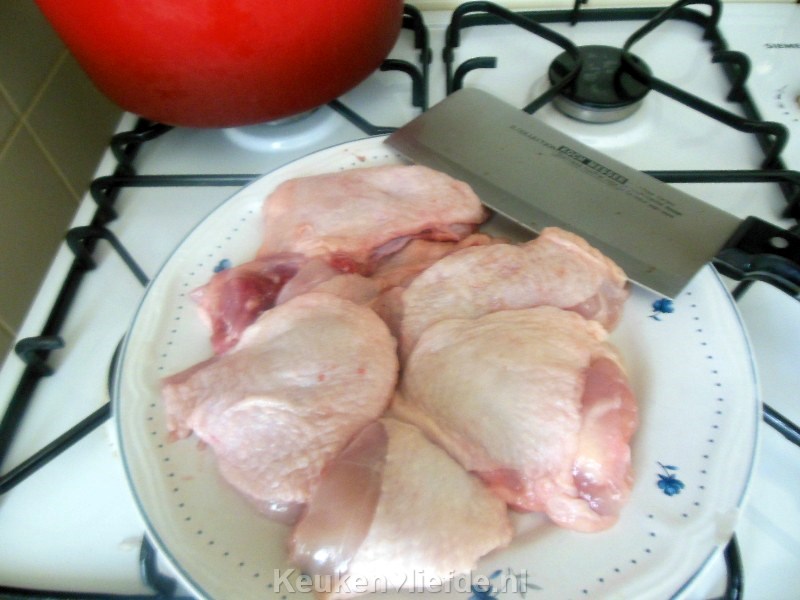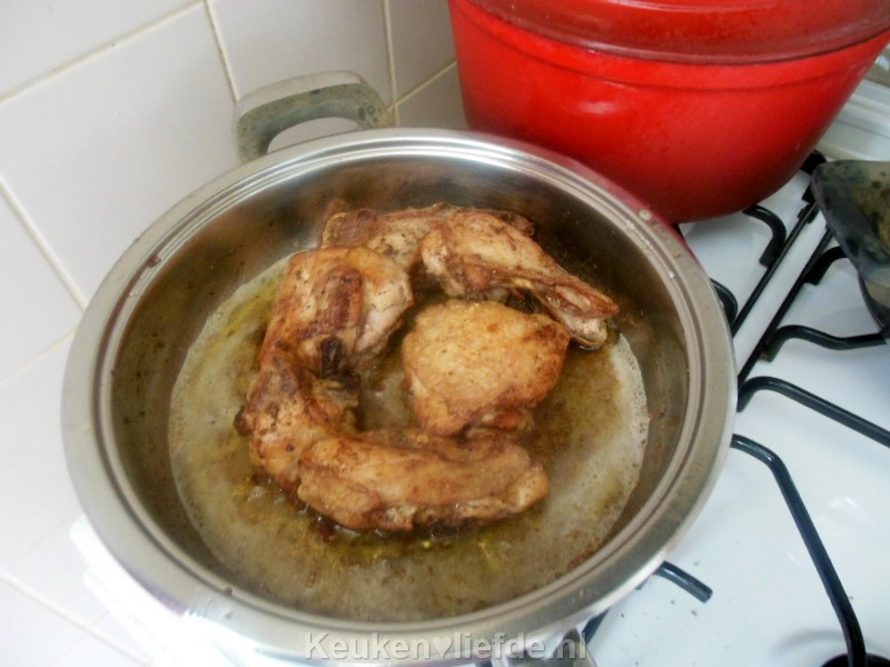 Kip rondom bruin bakken in olie en/of boter (ik doe beide), uit de pan halen en af laten koelen.