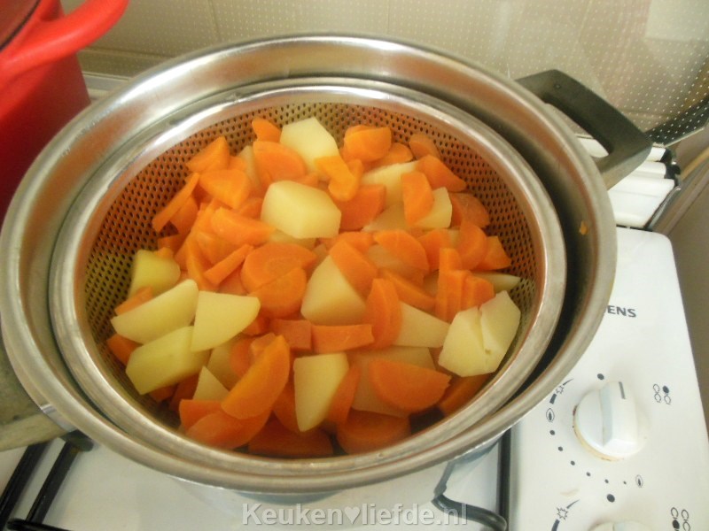De wortel schillen en in plakjes snijden. De aardappel schillen en in blokjes snijden. Ik doe beide even kort koken, eerst de wortels en als die koken de aardappel erbij. Vervolgens in een vergiet laten uitlekken.