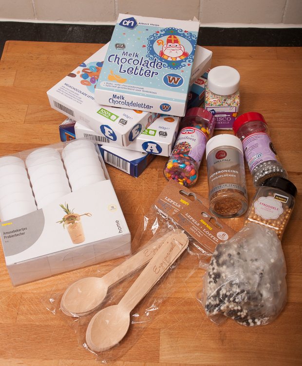 - 250 g melkchocolade (ik gebruikte mijn voorraad melkchocoladeletters die overbleven na Sinterklaas)