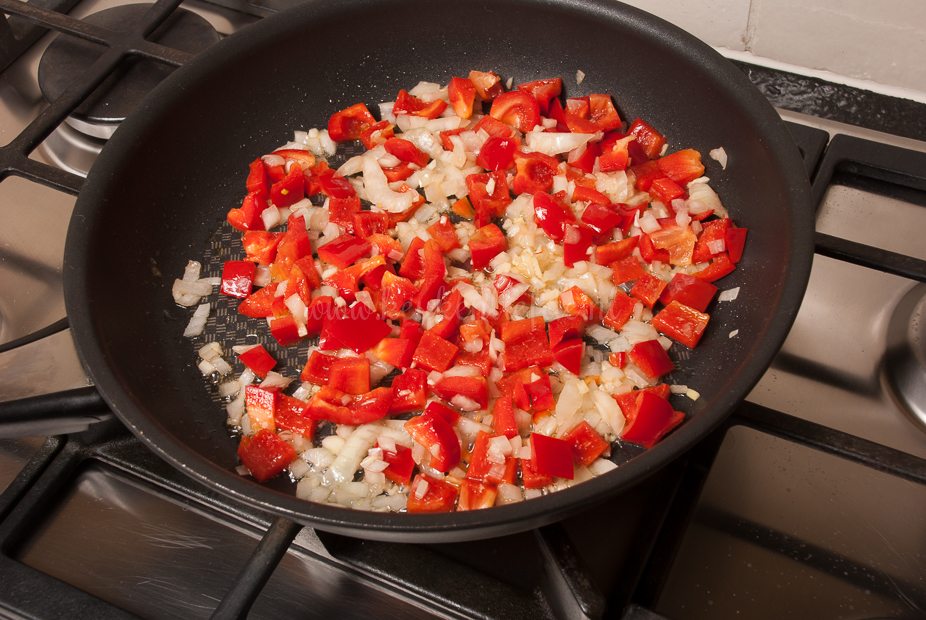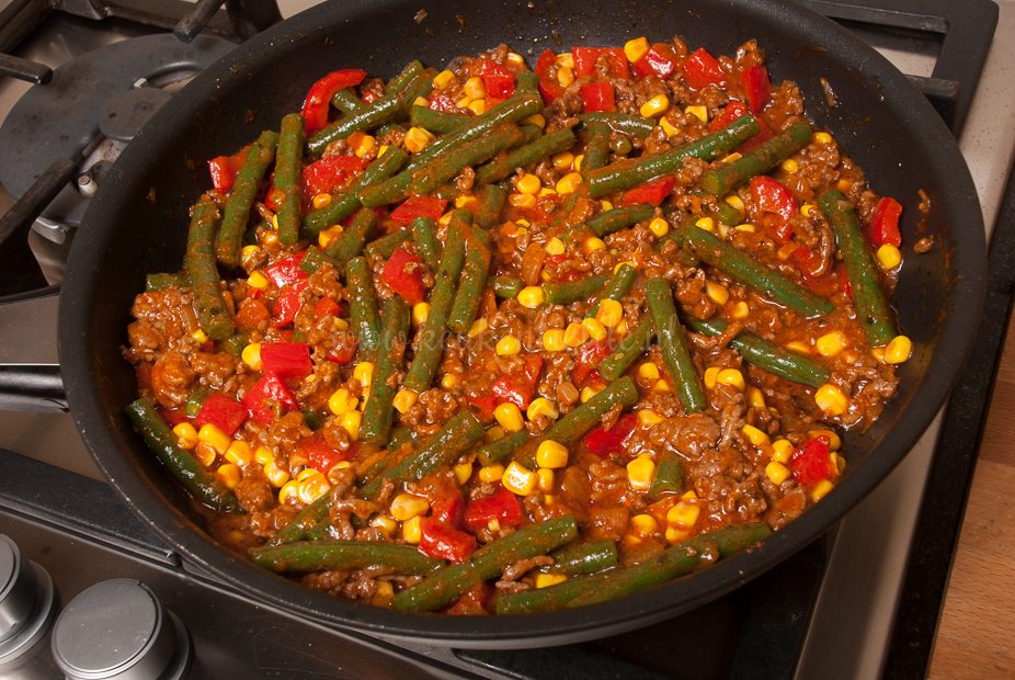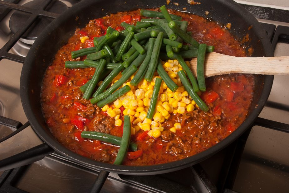Verhit een koekenpan met wat olie en fruit de ui, knoflook en paprika zachtjes aan, totdat de ui zacht is. Voeg het gehakt en de kruiden toe en bak enkele minuten mee. Voeg circa 2/3 van de tomatenfritto, sperziebonen en maiskorrels toe en warm alles kort even door. Breng indien nodig extra op smaak met zout en peper. Zet het vuur uit.