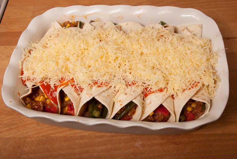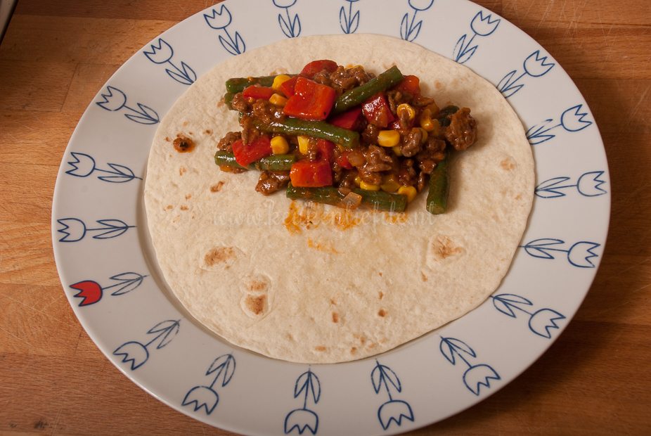 Mmm heerlijk! Ik heb ze net gemaakt zonder sperziebonen. Ik besmeer de tortilla eerst met creme fraiche, en strooi daar al wat geraspte kaas over, en daarna de vulling erop.