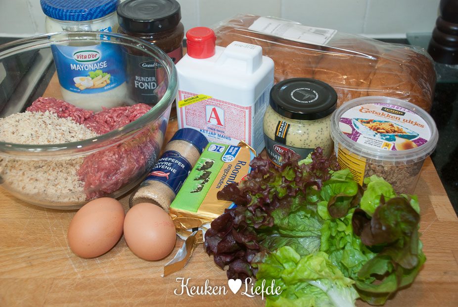 Beleg de onderkant met sla en leg hierop een in plakken gesneden gehaktbal. Drizzle nog wat saus over het gehakt en bestrooi met gebakken uitjes.