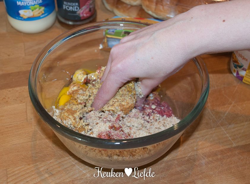 Roer in een kommetje een saus van wat mayonaise, mosterd en een klein beetje jus van de gehaktballen. Bepaal de verhouding/hoeveelheid op eigen gevoel en naar eigen smaak.