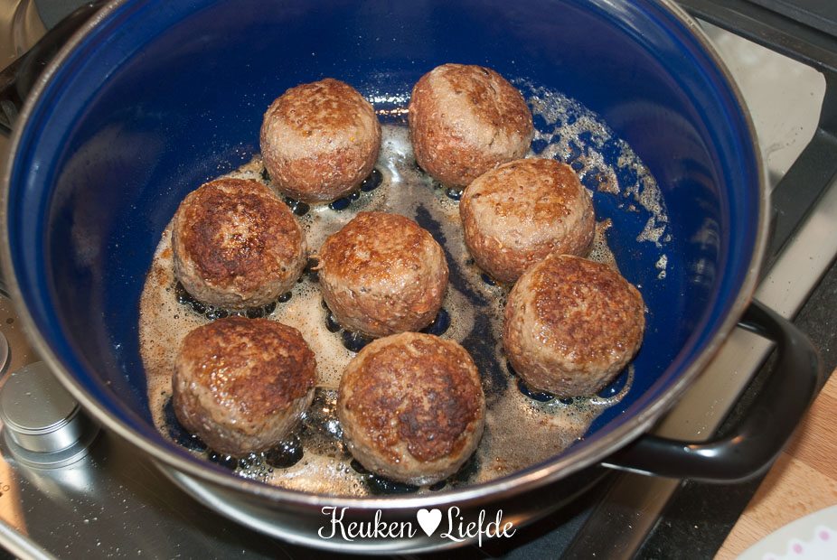 Voeg de fond toe, breng aan de kook en zet het vuur laag. De jus mag niet meer borrelen, maar moet heel zachtjes trekken. Laat de ballen in circa 30 tot 40 minuten gaar worden, ze moeten zacht en sappig blijven. Draai de gehaktballen regelmatig om.