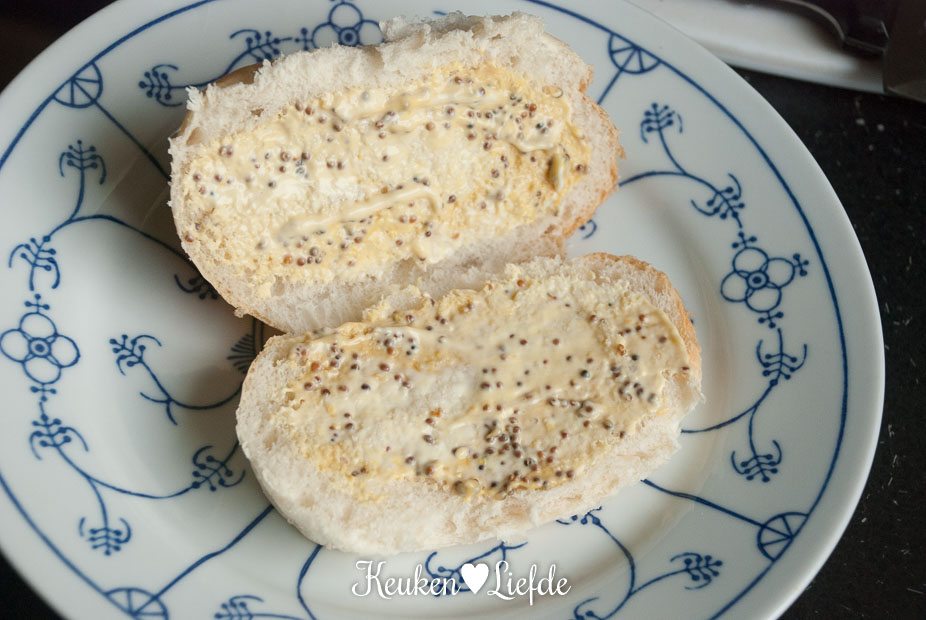 Snijd de broodjes – net niet helemaal – open en bestrijk beide kanten met de saus.