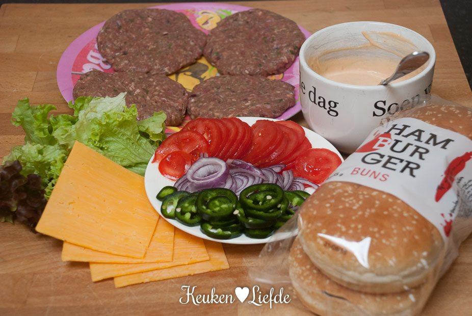 Roer de de ingrediënten voor de hamburgersaus door elkaar en zet weg.