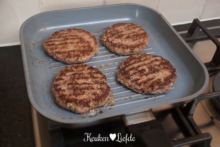 Kneed alle ingrediënten voor de hamburgers door elkaar en vorm er 4 gelijke hamburgers van. Leg ze op een bord en dek af met vershoudfolie. Laat ze minimaal een uur in de koelkast rusten.