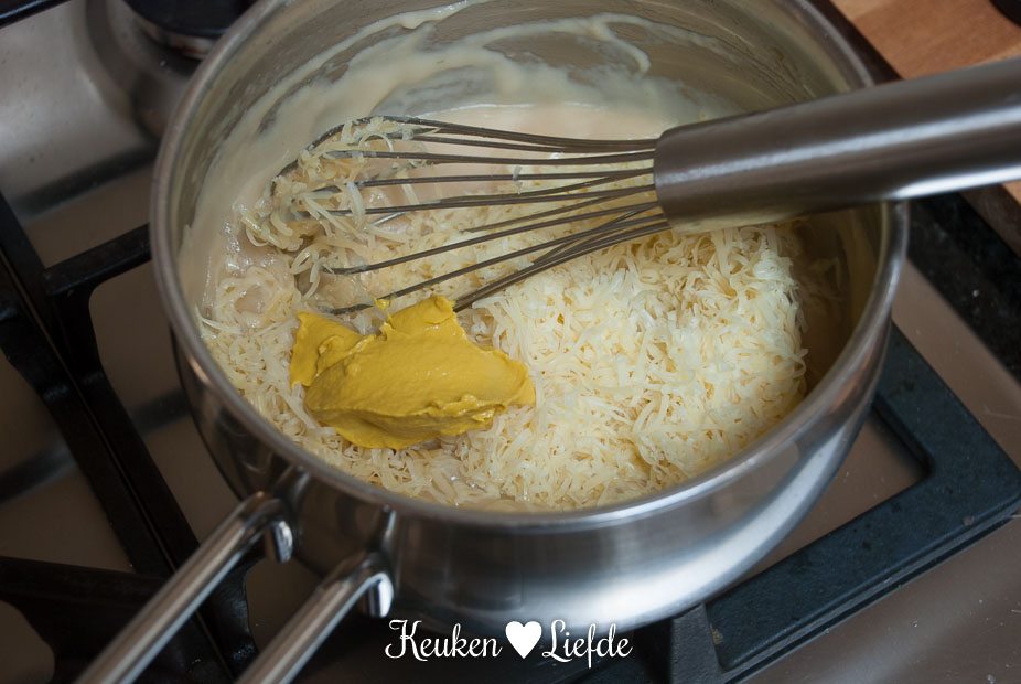 Smelt de boter en voeg de bloem toe. Laat de bloem al roerend garen, maar niet bruin worden. Dit duurt ongeveer een minuut. Giet langzaam de bouillon erbij en blijf roeren totdat je een dikke ragout hebt. Voeg de kaas, mosterd en bieslook toe en breng op smaak met peper.