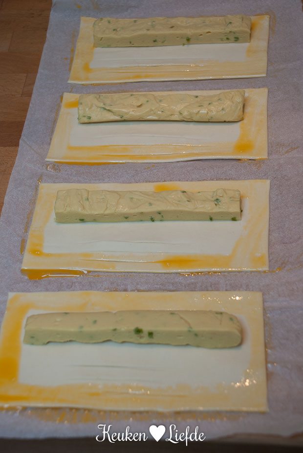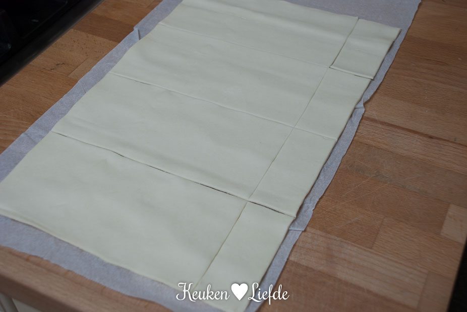 In repen sneden en op het bladerdeeg leggen.)