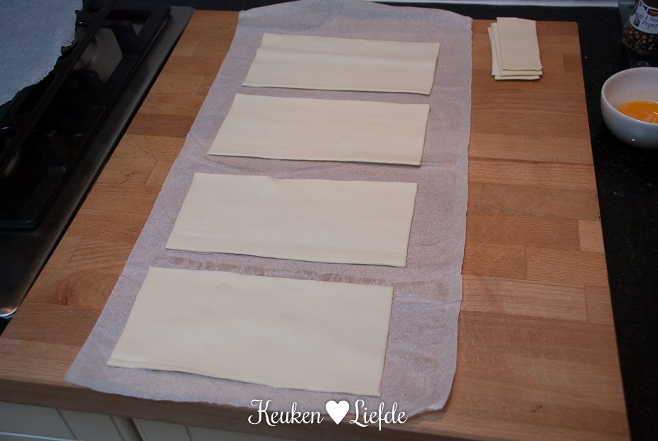 Rol het bladerdeeg uit en snij het deeg in 4 gelijke stukken van circa 10 x 20 cm.