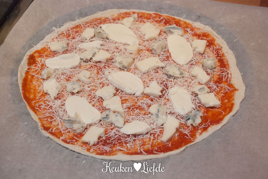 Verwarm de oven voor op de hoogste stand. (Bij ons is dat 220 graden.) Besmeer de pizzabodem met de tomatensaus — houd 1 cm van de rand vrij — en beleg met de vier kazen. Begin met geraspte pecorino en verdeel dan de overige kazen erover.