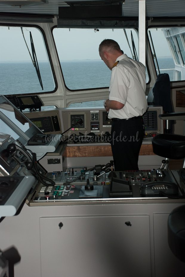 Ondertussen zijn we hoog boven zee de brug binnengewandeld om de hand te schudden van de sympathieke kapitein.