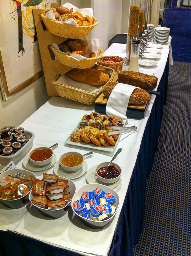 Na drie koppen koffie ben ik klaarwakker en zelfs aspirientjes zijn overbodig. Zeelucht doet wonderen! Het is acht uur als we aan het ontbijt zitten. Ik doe meteen maar gek. Nu geen yoghurt en ook geen fruit voor mij. Ik snak naar roerei en spek en roomboter en croissants en oneindig veel kaas. Jiehoe!