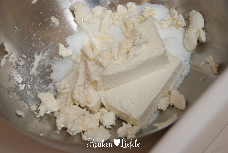 Klop de monchou met de suiker en vanillesuiker tot een glad en romig geheel.