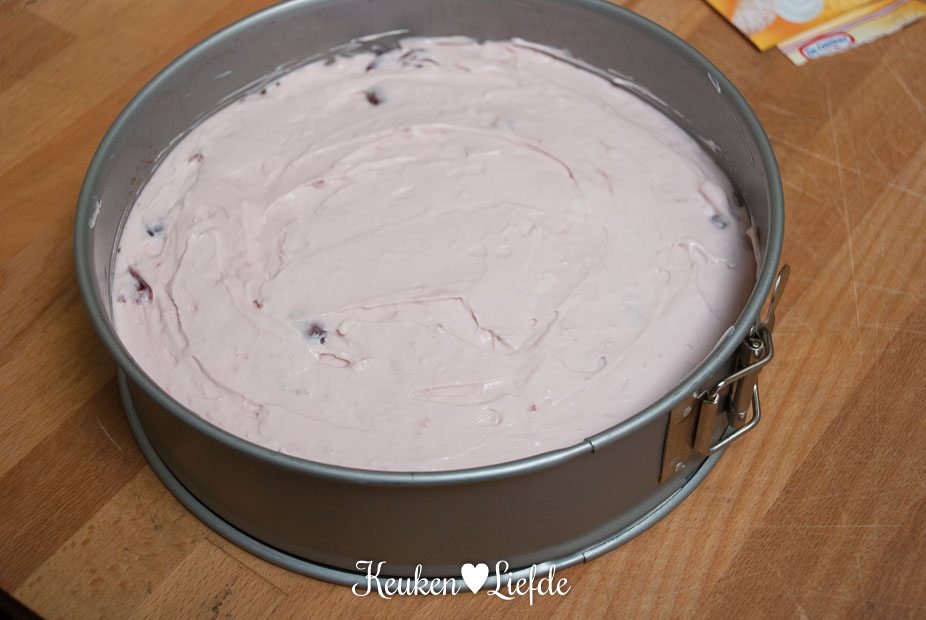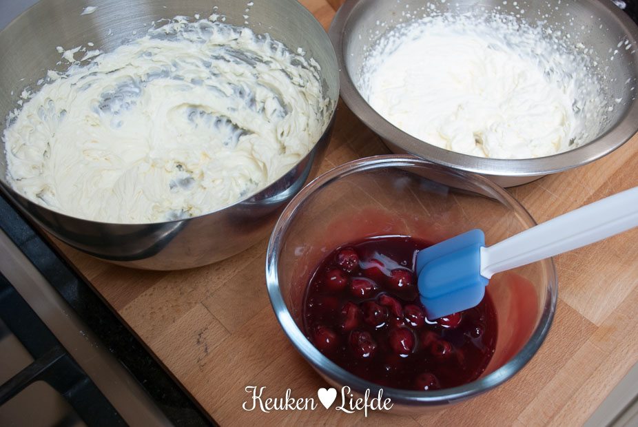 Roer om en om de slagroom en kersencompote door de monchou en roer tot een glad geheel. Giet het mengsel over de koekjesbodem in de springvorm en zet minimaal 4 uur (een hele nacht mag ook) in de koelkast om op te stijven.