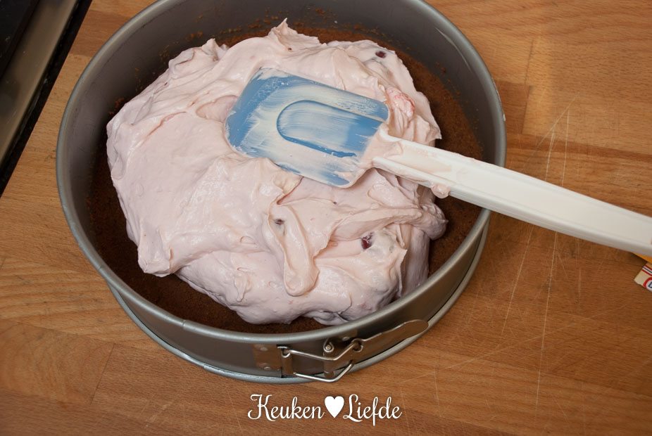 Roer om en om de slagroom en kersencompote door de monchou en roer tot een glad geheel. Giet het mengsel over de koekjesbodem in de springvorm en zet minimaal 4 uur (een hele nacht mag ook) in de koelkast om op te stijven.