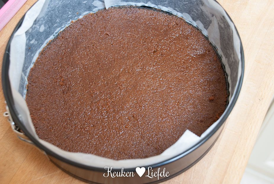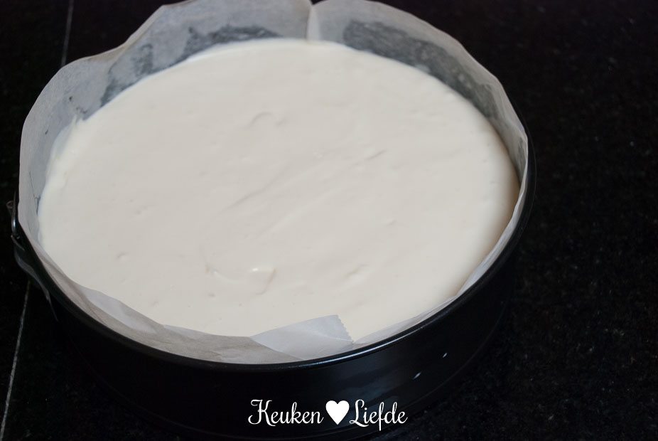 Giet het roomkaasmengsel over de bodem van de springvorm en bak 90 minuten in de oven. (Zorg ervoor dat je onder de taart een bakblik bekleed met bakpapier schuift, de bodem van de taart kan iets gaan lekken.)