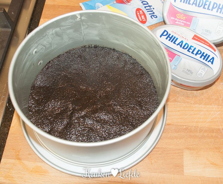 Smelt de roomboter in een pannetje op laag vuur. Vermaal de Oreo koekjes in een staafmixer of keukenmachine tot fijne kruimels en voeg samen met de cacaopoeder toe aan de boter. Roer goed door en verdeel ze over de bodem van de springvorm. Druk goed aan. Zet in de koelkast.